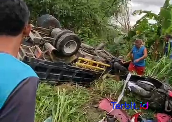 Akibat tabrakan tersebut truk terbalik di rerumputan pinggir jalan. Sementara motor yang dikendarai korban dalam kondisi rusak berat. Jasad salah seorang korban dalam keadaan tertindih di bawah truk.